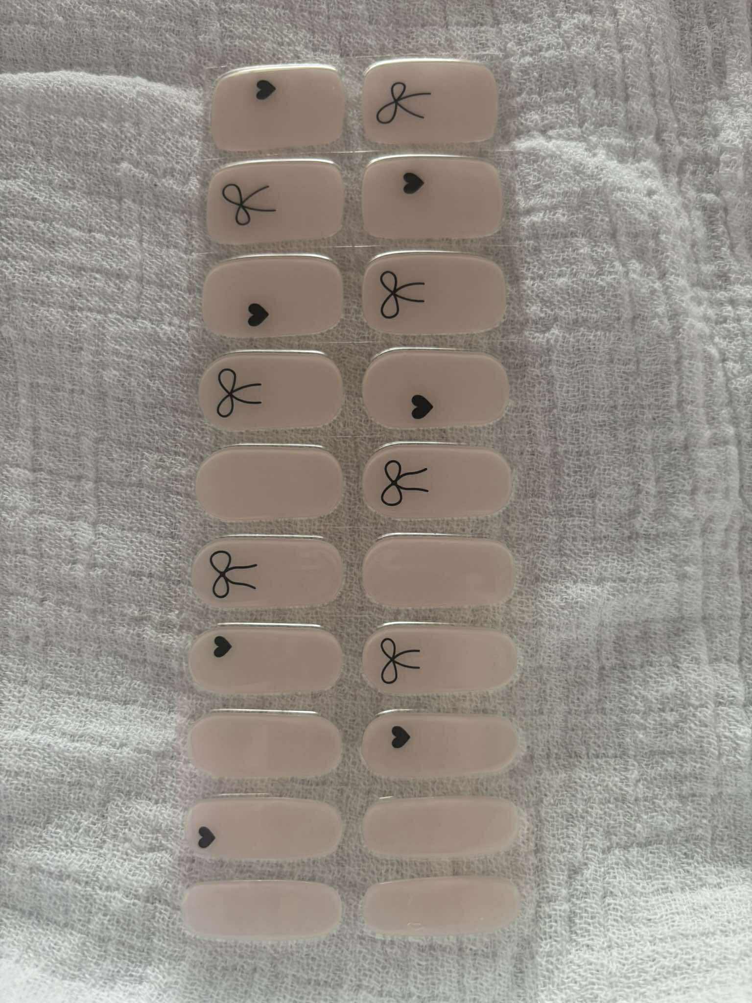 Coquette Ballet Slipper are a very pale pink (almost white) translucent natural looking nail with dainty hearts and bows.